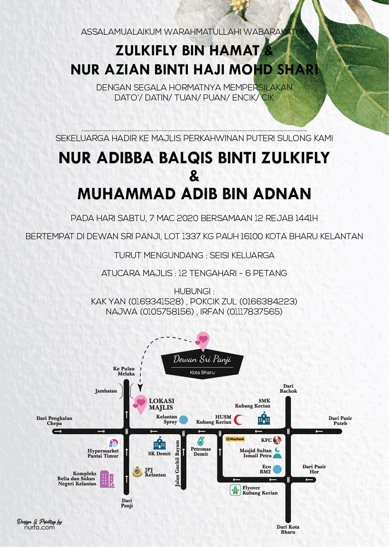 HARI BAHAGIA KAMI LAGI.. [hurrytimer id="3570"] [hurrytimer id="3570"] 8 Comments Cik Ija, Cik Ejoy, Hasya & Hanan on 07/03/2020 at 6:38 pm Congratulations Adib & Wife! See u both in Beranang InsyaAllah.. Reply Farhan on 24/02/2020 at 6:42 pm Tahniah dib dan pasangan. Maaf tak dpt join kenduri jauh.. InsyaAllah kenduri dekat gua sampai..aku doakan semoga korg berbahagia hingga ke jannah..selamat menempuh alam baru hidup baru ..alhamdulillah Reply Cik Nana ....Kg Pandan😘 on 24/02/2020 at 7:19 am Tahniah Adip & isteri….semoga murah rezeki dan berbahagia hingga ke Jannah…Aminn yra👨💘👰 Reply Anonymous on 02/03/2020 at 1:55 pm Tak pe Adik Nana. Kat Beranang nanti…hadirkan diri ye. Naj on 17/02/2020 at 12:23 pm Semoga semuanya berjalan lancar.. maaf kerana tidak dapat menghadirkan diri pada hari majlis. Reply Ayoh abcd on 11/02/2020 at 11:53 pm Tahniah Reply Umi on 11/02/2020 at 3:43 pm Tahniah long… Reply cubob on 01/03/2020 at 4:08 pm semoga dipermudahkan segala urusan nanti.. Leave a Reply to Cik Nana ....Kg Pandan😘 Cancel reply~GUESTBOOK~Name Comment * Submit Comment e-Kad Add to Calendar Drive to Location Contact Us Ekadpro oleh Nurfa.com Google & Apple Calendar Kak Yan PokCik Zul Najwa Irfan