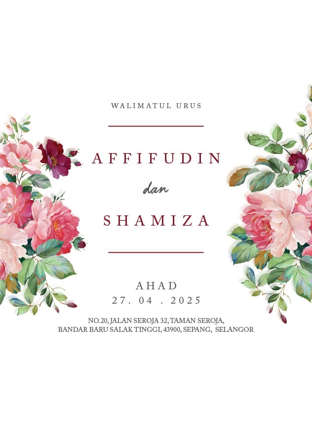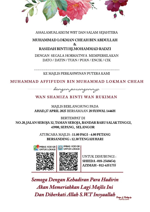 Menghitung Hari Day(s) : Hour(s) : Minute(s) : Second(s) https://ekad.pro/wp-content/uploads/2022/09/Anis-Nazmi-MP3.mp3 18 Comments Hadi Azrie on 27/04/2025 at 7:47 am congratulations to your wedding semoga bahagia dunia akhirat ❤️ Reply Cabin Banana BY Rin's on 26/04/2025 at 7:34 am Tahniah.Moga bahagia till jannah. Reply Arimza on 22/04/2025 at 10:28 pm Tahniah dik semoga kekal bhgia hingga ke jannah aamiin Reply Heidy on 22/04/2025 at 5:45 pm Selamat pengantin baru Reply King RLS on 22/04/2025 at 5:16 pm Congrats.. Selamat penganti baru semoga kekal hingga till jannah🙌 Reply Hazrul GTR on 22/04/2025 at 4:45 pm Selamat pengantin baru Afif, semoga bahagia bersama pasangan sampai akhir hayat Reply Mr.A on 22/04/2025 at 4:38 pm Semoga dipermudahkan majlis Dari awal hingga akhir,Dan kekal bahagia hingga ke jannah..tahniah affif Dan istri Reply Faisal js28 on 18/04/2025 at 3:21 pm Semoga dipermudahkan urusan, didoakan kekal bahagia till jannah Reply Anonymous on 02/04/2025 at 3:25 pm Congrats bro semoga dipermudahkan segala urusan dan kekal ke jannah Reply Mior Muhammad Amirazmi on 01/04/2025 at 5:36 pm Tak Sabarrrr!!!!! Reply Nalyyy on 28/03/2025 at 11:20 pm InshAllah akn sya hadir🤲🏻 Reply Ibu Shieda on 28/03/2025 at 9:49 pm Ibu doakan semoga Along & mija kekal bahagia selalu dan semoga Allah swt berkati perkhawinan korang berdua..Aaminn🤲🏻 Love you Always🫰🏻😘 Reply Mama Maleeq on 28/03/2025 at 9:15 pm Selamat bercinta sampai ke syurga aunty ja n suami 🌹 Reply meen on 28/03/2025 at 9:11 pm semoga perkahwinan yg dibina penuh dgn barokah wa rahmah wa mawaddah wa sakinah. Ameen🤍 Reply yaya on 28/03/2025 at 7:44 pm aaaa comelnyeeeee 🥺 semoga kekal smpai bila ii amiin Reply Hernie on 28/03/2025 at 6:34 pm Moga bahagia till jannah ❤️❤️❤️ Reply Ummu syamim on 28/03/2025 at 6:16 pm Ibu doakan semoga berkekalan berbahagia hingga jannah. Reply Mama Yusuf on 28/03/2025 at 5:55 pm Semoga bahtera yang dibina kekal hingga ke syurga 🩵 barakallahu lakuma wajamaa’ baynakuma fi khayr 💙 Reply Submit a Comment Cancel reply~GUESTBOOK~Name Comment * Submit Comment Footer menu