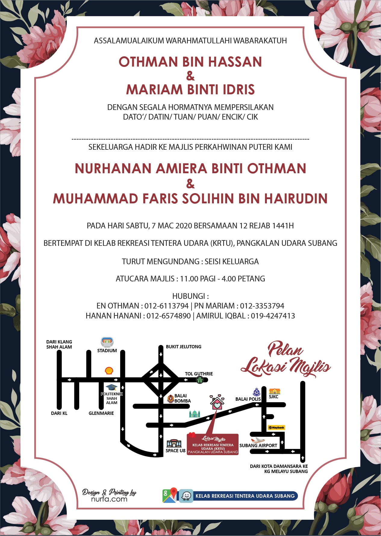 Mohan 708180 Dan keluarga on 16/02/2020 at 1:15 pm Terima kasih keluarga En Othman & Puan Mariam menjemput keluarga kami untuk memeriahkan perkhawinan puteri Amiera. Senyum selalu Reply