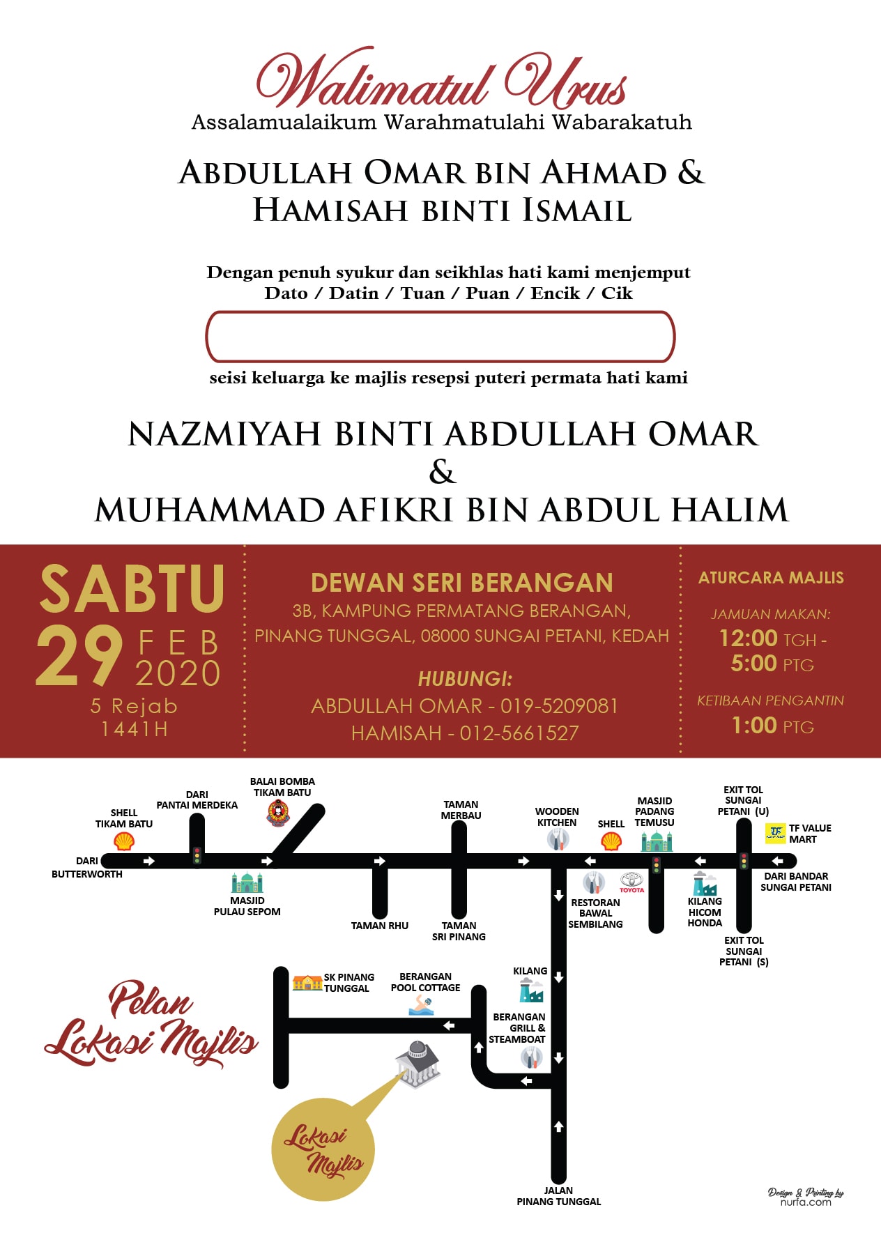 HARI BAHAGIA KAMI LAGI.. [hurrytimer id="3065"] [hurrytimer id="3065"] 6 Comments i am Legend on 28/02/2020 at 9:36 pm Congrats sistor..💪 Reply Leo on 26/02/2020 at 2:33 pm Congratulations naz & husband.. Semoga kekal hingga ke jannah.. Aamiin… Reply Mashi on 04/02/2020 at 6:06 pm Congrats kak naz…. Moga bahagia sapai ke syurga… Reply Arin Adrina on 03/02/2020 at 3:42 pm Congratulations sis ise hahahaha finally your day! Hehehe semoga kekalan hingga syurga 💕 Reply Syiera. on 03/02/2020 at 1:39 pm Tahniahh kak naz. semoga perkahwinan ini kekal hingga ke syurga . aminnn Reply Nur aisyah on 03/02/2020 at 1:33 pm Congrats kak naz.. Smoga perkahwinan ni kekal hingga ke syurga.. Reply Submit a Comment Cancel reply~GUESTBOOK~Name Comment * Submit Comment e-Kad Add to Calendar Drive to Location Contact Us Ekadpro oleh Nurfa.com Google & Apple Calendar Abdullah Omar Hamisah